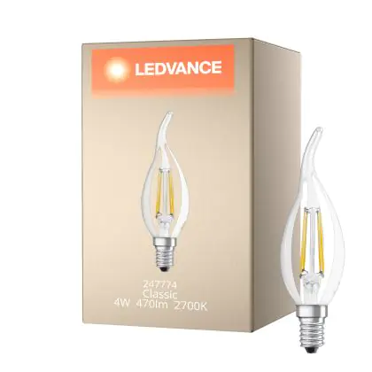 Die Ledvance Classic LED E14 Kerze Fadenlampe Klar 4W 470lm - 827 Extra Warmweiß | Ersatz für 40W ist eine effiziente E14 LED-Lampe mit Retrodesign und der perfekte Ersatz für Ihre konventionellen 40W Lampen mit E14. Zudem strahlt sie Licht in der Farbtemperatur 2700K - Extra Warmweiß aus und punktet durch eine lange Lebensdauer.