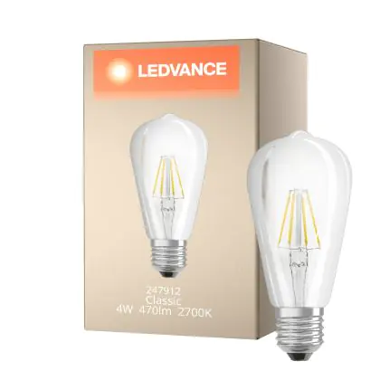 Die Ledvance Classic LED E27 Birne Fadenlampe Klar 4W 470lm - 827 Extra Warmweiß | Ersatz für 40W ist eine effiziente E27 LED-Lampe mit Retrodesign und der perfekte Ersatz für Ihre konventionellen 40W Lampen mit E27. Zudem strahlt sie Licht in der Farbtemperatur 2700K - Extra Warmweiß aus und punktet durch eine lange Lebensdauer.