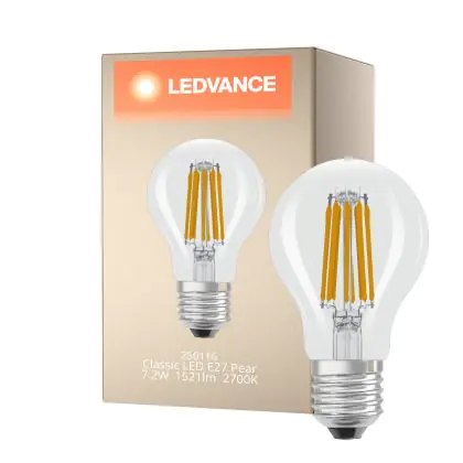 Die Ledvance Classic LED E27 Birne Fadenlampe Klar 7.2W 1521lm - 827 Extra Warmweiß | Ersatz Für 100W ist eine effiziente E27 LED-Lampe mit Retrodesign und der perfekte Ersatz für Ihre konventionellen 100W Lampen mit E27. Zudem strahlt sie Licht in der Farbtemperatur 2700K - Extra Warmweiß aus und punktet durch eine lange Lebensdauer.