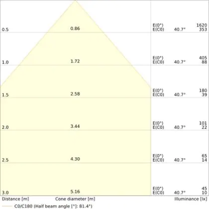 Der Abstrahlwinkel bezeichnet den Winkel, in dem das Licht aus der Lichtquelle ausgestrahlt wird. Er wird in Grad (D) angegeben. Je geringer die Gradzahl des Abstrahlwinkels ist, desto kleiner ist auch der Durchmesser des Lichtkegels, den die Lichtquelle produziert. Beispiel: Wird eine Lampe mit einem Abstrahlwinkel von 60 Grad an der Decke (2,5 m Höhe) angebracht, erzeugt sie einen Lichtkegel von 2,9 Metern Durchmesser. Hat die Lampe hingegen einen Abstrahlwinkel von 120 Grad, beträgt der Lichtkegel 8,7 Meter im Durchmesser. |