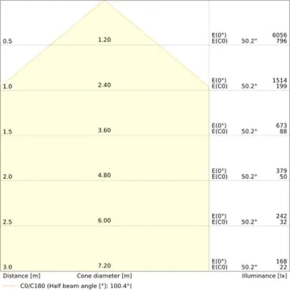 Der Abstrahlwinkel bezeichnet den Winkel, in dem das Licht aus der Lichtquelle ausgestrahlt wird. Er wird in Grad (D) angegeben. Je geringer die Gradzahl des Abstrahlwinkels ist, desto kleiner ist auch der Durchmesser des Lichtkegels, den die Lichtquelle produziert. Beispiel: Wird eine Lampe mit einem Abstrahlwinkel von 60 Grad an der Decke (2,5 m Höhe) angebracht, erzeugt sie einen Lichtkegel von 2,9 Metern Durchmesser. Hat die Lampe hingegen einen Abstrahlwinkel von 120 Grad, beträgt der Lichtkegel 8,7 Meter im Durchmesser. |