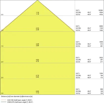 Der Abstrahlwinkel bezeichnet den Winkel, in dem das Licht aus der Lichtquelle ausgestrahlt wird. Er wird in Grad (D) angegeben. Je geringer die Gradzahl des Abstrahlwinkels ist, desto kleiner ist auch der Durchmesser des Lichtkegels, den die Lichtquelle produziert. Beispiel: Wird eine Lampe mit einem Abstrahlwinkel von 60 Grad an der Decke (2,5 m Höhe) angebracht, erzeugt sie einen Lichtkegel von 2,9 Metern Durchmesser. Hat die Lampe hingegen einen Abstrahlwinkel von 120 Grad, beträgt der Lichtkegel 8,7 Meter im Durchmesser. |