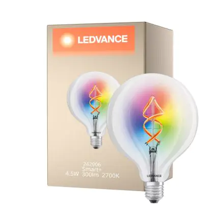 Die Ledvance Smart+ Wifi E27 Globe Classic Fadenlampe 4.5W 300lm - 827 Extra Warmweiß | RGBW - Ersatz für 30W ist eine effiziente E27 LED-Lampe mit Retrodesign und der perfekte Ersatz für Ihre konventionellen 30W Lampen mit E27. Zudem strahlt sie Licht in der Farbtemperatur 2700K - Extra Warmweiß + RGB aus und punktet durch eine lange Lebensdauer.