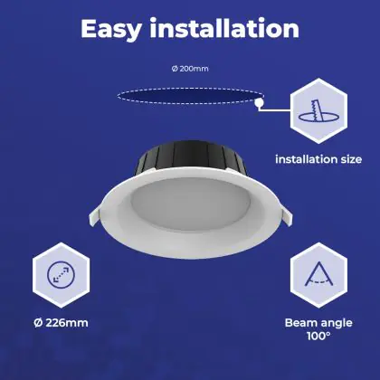 Die Noxion LED Downlight Hera Mittel Einbau Weiß 21W 2400lm - 827-830-840 CCT | 226mm - Ausschnitt 200mm ist eine Feuchtraumleuchte. Sie strahlt Licht in der Farbtemperatur 2700K - 3000K - 4000K CCT aus und punktet durch eine lange Lebensdauer. Diese Leuchte ist speziell zur Verwendung in Feuchträumen (Keller, Waschräume, etc.) vorgesehen.