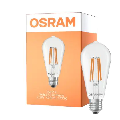 Die Osram LED Lamps E27 Edison Fadenlampe Klar 2.2W 470lm - 827 Extra Warmweiß | Ersatz Für 40W ist eine effiziente E27 LED-Lampe mit Retrodesign und der perfekte Ersatz für Ihre konventionellen 40W Lampen mit E27. Zudem strahlt sie Licht in der Farbtemperatur 2700K - Extra Warmweiß aus und punktet durch eine lange Lebensdauer.