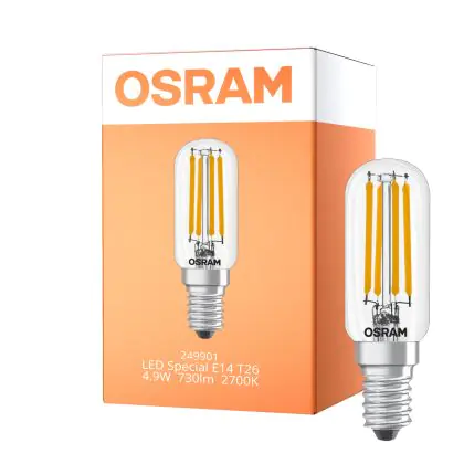 Die Osram LED Special E14 Tubular Glühbirne T26 Fadenlampe Klar 4.9W 730lm - 827 Extra Warmweiß | Ersatz Für 55W ist eine effiziente E14 LED-Lampe mit Retrodesign und der perfekte Ersatz für Ihre konventionellen 55W Lampen mit E14. Zudem strahlt sie Licht in der Farbtemperatur 2700K - Extra Warmweiß aus und punktet durch eine lange Lebensdauer.