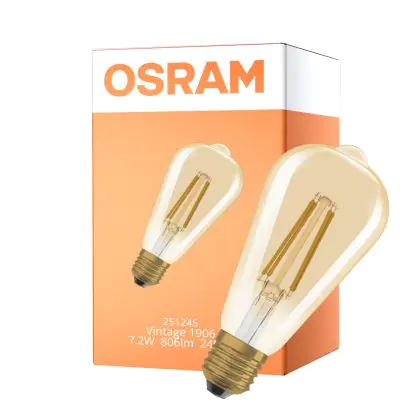 Die Osram Vintage 1906 LED E27 Edison Fadenlampe Gold 7.2W 806lm - 824 Extra Warmweiß | Ersatz Für 60W ist eine effiziente E27 LED-Lampe mit Retrodesign und der perfekte Ersatz für Ihre konventionellen 60W Lampen mit E27. Zudem strahlt sie Licht in der Farbtemperatur 2400K - Extra Warmweiß aus und punktet durch eine lange Lebensdauer.