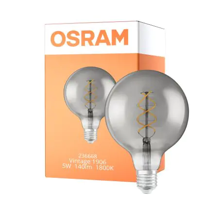 Die Osram Vintage 1906 LED E27 Globe Fadenlampe Smoke 125mm 5W 140lm - 818 Extra Warmweiß | Ersatz für 15W ist eine effiziente E27 LED-Lampe mit Retrodesign und der perfekte Ersatz für Ihre konventionellen 15W Lampen mit E27. Zudem strahlt sie Licht in der Farbtemperatur 1800K - Extra Warmweiß aus und punktet durch eine lange Lebensdauer.