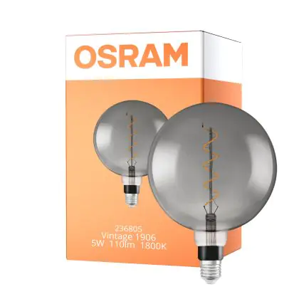 Die Osram Vintage 1906 LED E27 Globe Fadenlampe Smoke 200mm 5W 110lm - 818 Extra Warmweiß | Ersatz für 25W ist eine effiziente E27 LED-Lampe mit Retrodesign und der perfekte Ersatz für Ihre konventionellen 25W Lampen mit E27. Zudem strahlt sie Licht in der Farbtemperatur 1800K - Extra Warmweiß aus und punktet durch eine lange Lebensdauer.