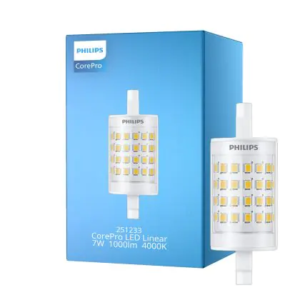 Die Philips CorePro LED R7S Linear 78mm Klar 7W 1000lm - 840 Kaltweiß | Ersatz Für 60W ist eine effiziente R7s LED-Lampe und der perfekte Ersatz für Ihre konventionelle Halogen-Stablampe mit W. Zudem strahlt sie Licht in der Farbtemperatur 4000K - Kaltweiß aus und punktet durch eine lange Lebensdauer.
