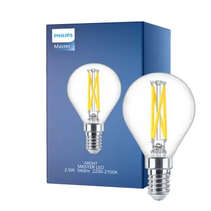 Die Philips MASTER LED E14 Kugel Fadenlampe Klar 2.5W 340lm - 922-927 Dim To Warm | Höchste Farbwiedergabe - Dimmbar - Ersatz Für 25W ist eine effiziente E14 LED-Lampe mit Retrodesign und der perfekte Ersatz für Ihre konventionellen 25W Lampen mit E14. Zudem strahlt sie Licht in der Farbtemperatur 2200K - 2700K Dim To Warm aus und punktet durch eine lange Lebensdauer.