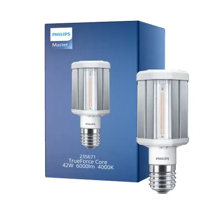 Die Philips TrueForce LED HPL E40 42W 840 Clear ist die ideale Außenbeleuchtung und ersetzt herkömmliche HPL/HQL- und SON/NAV-Gasentladungslampen. Mit LED profitieren Sie von hohen Energieeinsparungen und einer extrem langen Lebensdauer. Dank der hohen Effizienz bietet die TrueForce LED-Lampe gleichzeitig eine hohe Leuchtkraft.