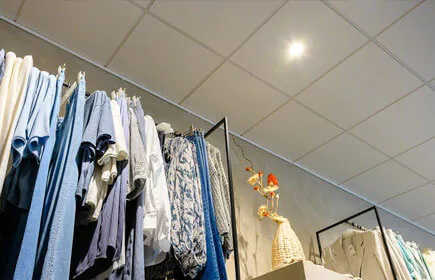 - Im Geschäft wurden nur Leuchten mit weißer Lichtfarbe verwendet, die eine ruhige Decke schaffen. Dadurch wird sichergestellt, dass die Besucher das Sortiment sofort im Blick haben (keine Ablenkung).